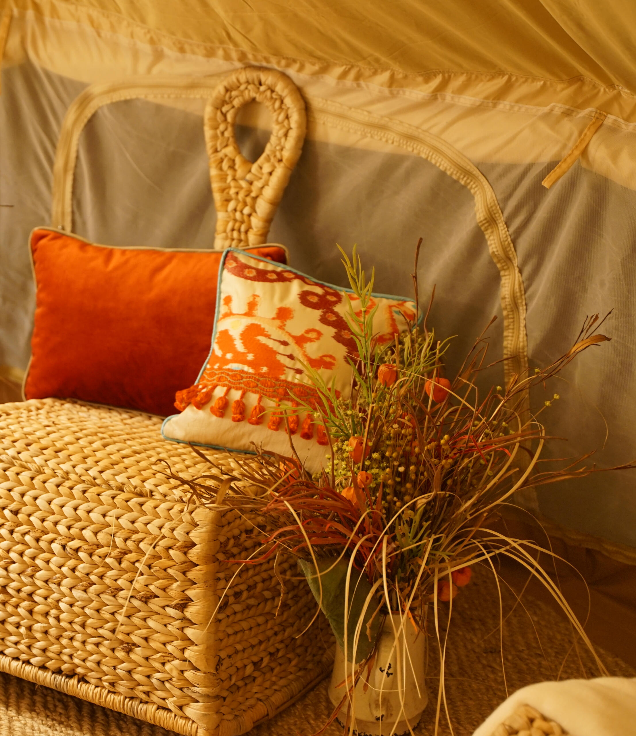 • In the orchard we have a total of 5 luxury canvas tents and one ‘A-frame’ (a rigid structure with the ‘feeling’ of a tent): two tents have 1 double bed, and three tents have 1 double bed and 1 single beds (usually used as a double room). The A frame has two single beds.