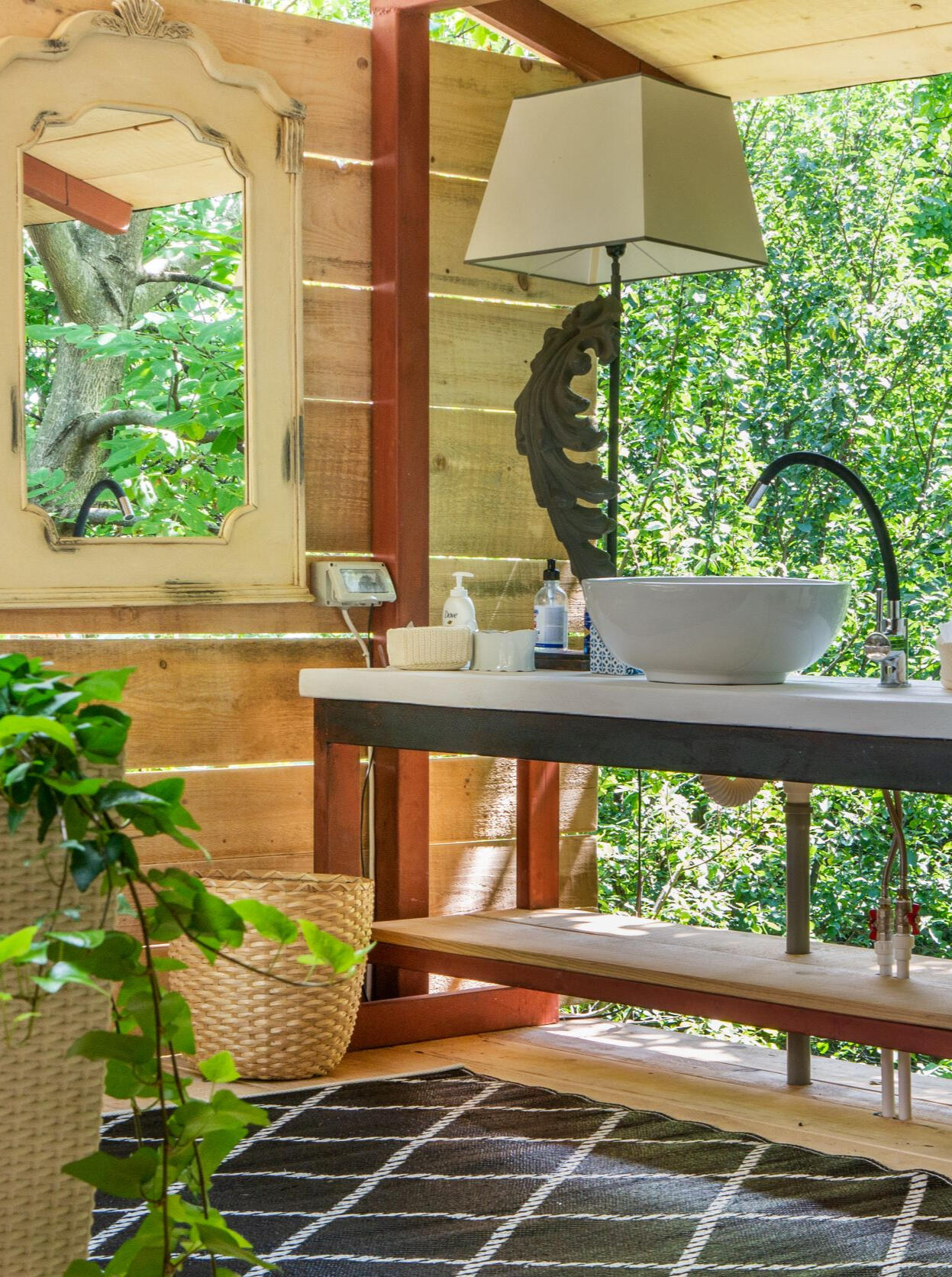 • The bathroom is a spacious “Bali style” common bathroom with a Forest view - 3 large shower cabins (thermostatic water taps), 3 toilets, and 3 sinks.